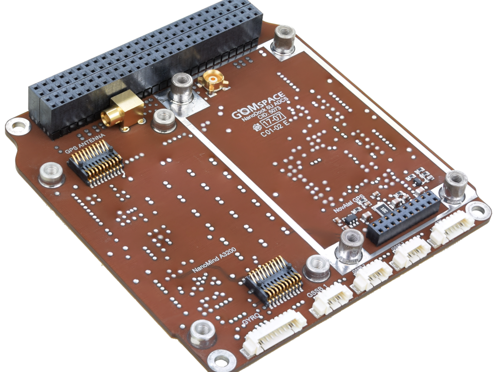 The GomSpace NanoDock ADCS-6 is designed to be a component in a complete ADCS system. On the NanoDock ADCS-6 can be mounted a NanoMind A3200 computer and a GomSpace NovAtel GPS. It has a number of connectors to external sensors and to a GomSpace NanoTorque GSW-600 reaction wheel.