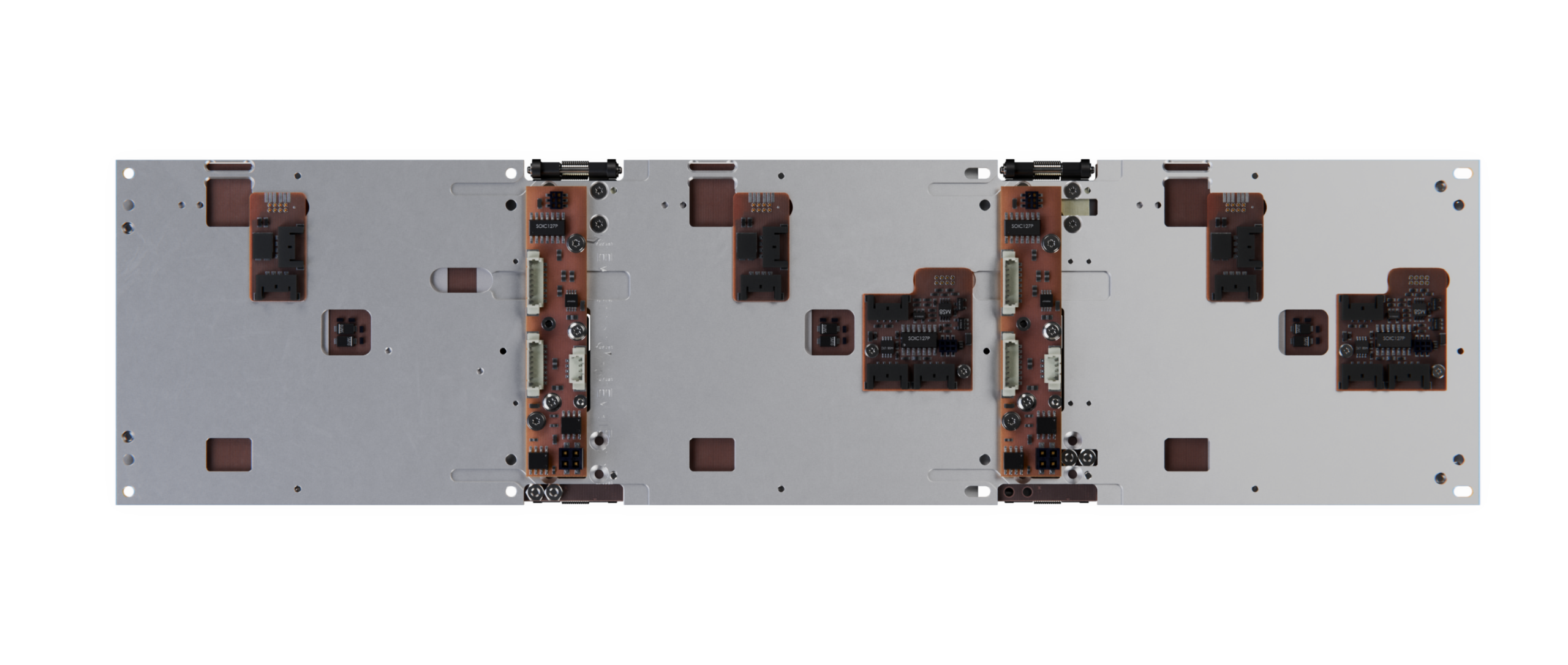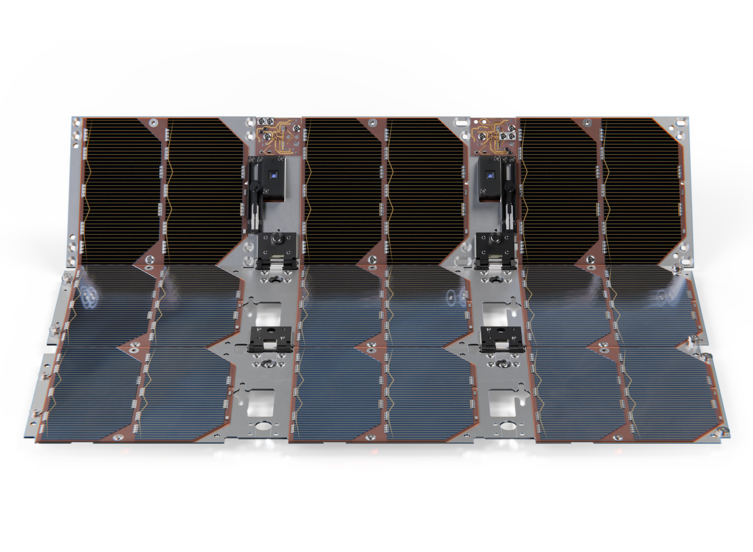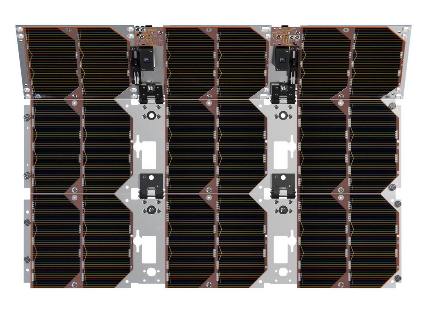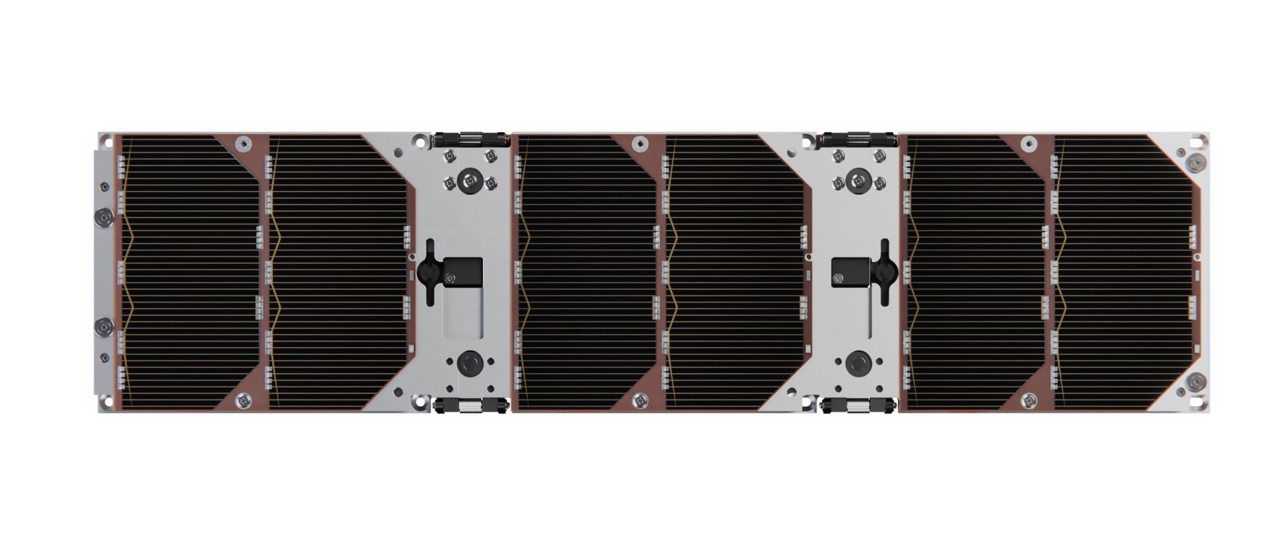 Our Deployable Solar Panel System (DSP) is designed to fit on the side of a 3U or 6U satellite. It is composed of three panels connected with spring loaded hinges. During launch the panels are folded to the side of the satellite inside the deployment pod. Once in space a release system deploys the panels.
