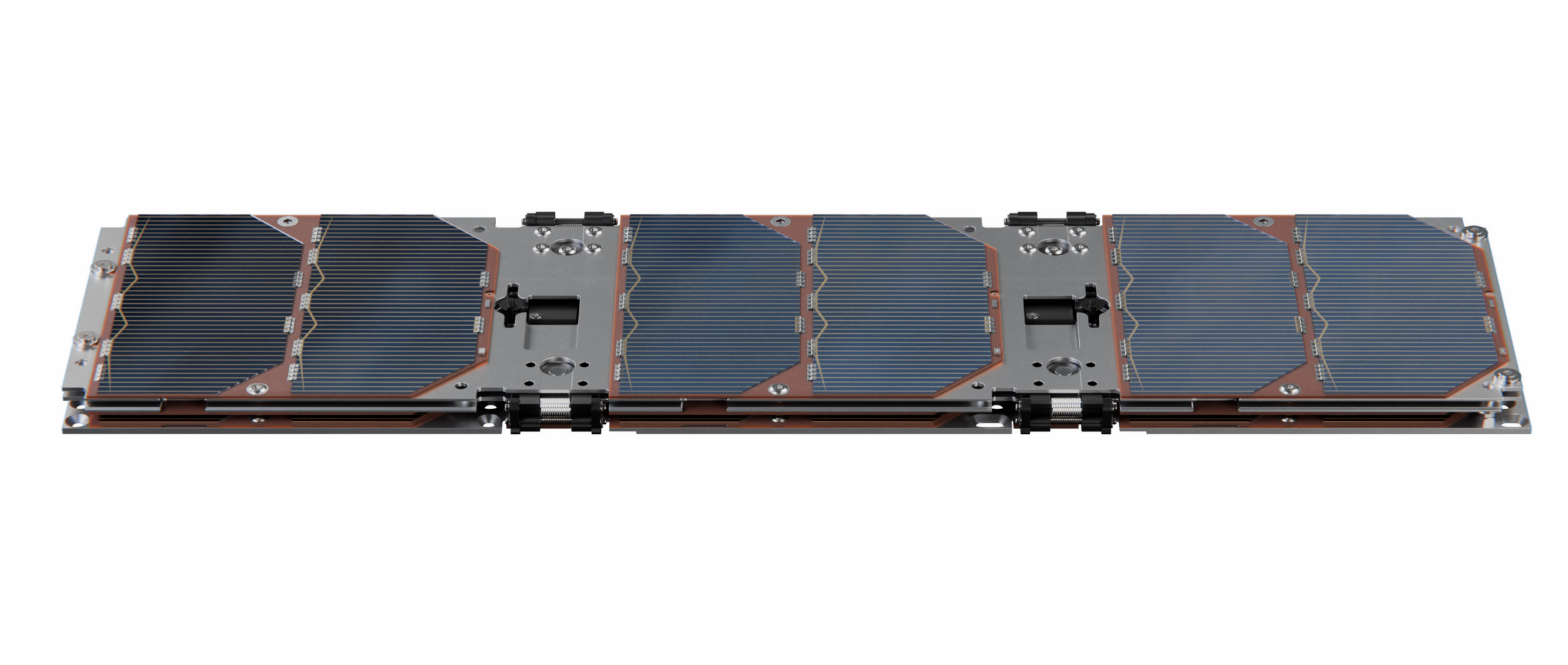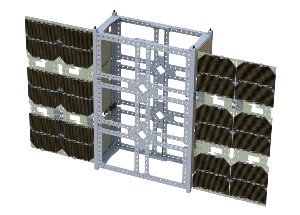 Each wing stows against the side of the satellite structure during launch and is deployed in orbit. The wingspan of a single deployed wing is 163 mm when mounted on a 6U structure.