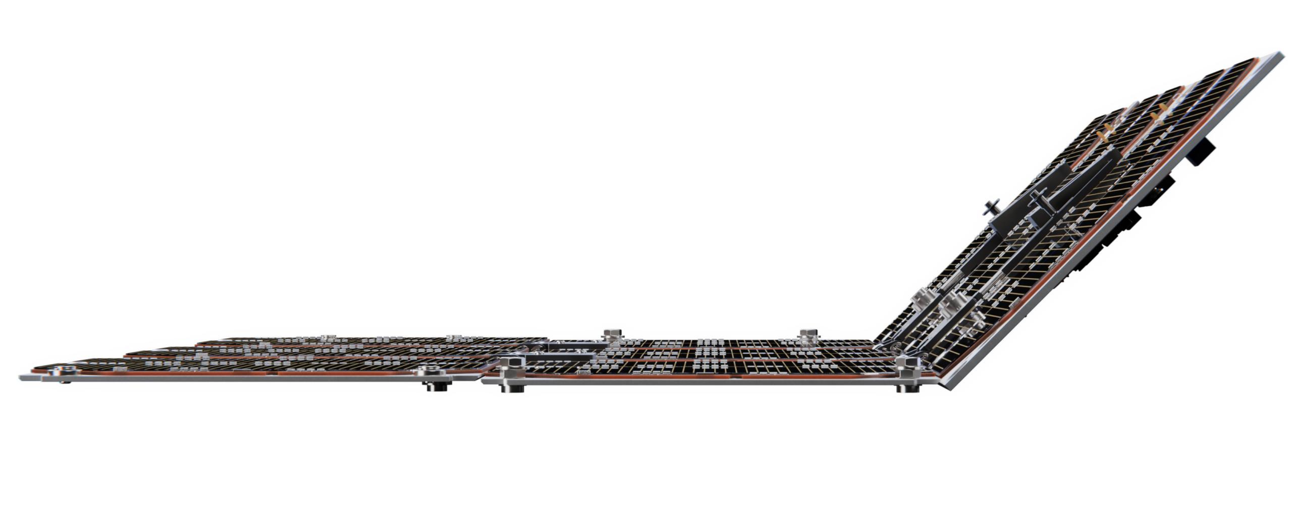 The Deployable Solar Panel (DSP) comes in three versions, a 135°, 135° reverse and a 90°, which can be mounted on a 3U or a 6U structure. Each version consist of a mounting panel for attaching to the spacecraft structure and 2 deployable panels covered with solar cells. By purchasing for example a 135-degree wing it will generate up to 18W per DSP.